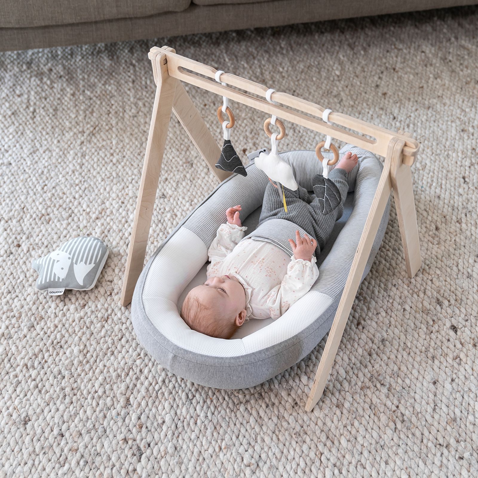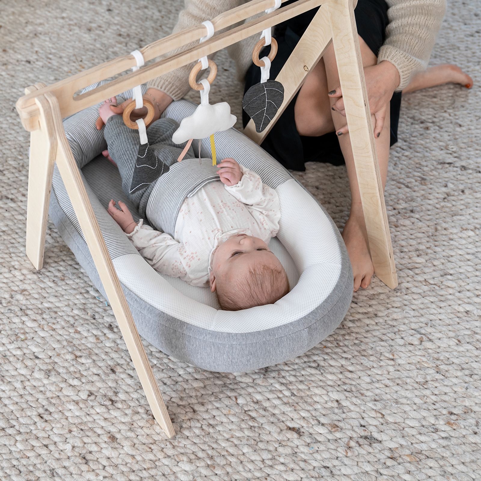 Cette arche de jeu est très facile à monter.Tu peux simplement fixer les jouets en bas de la barre pour qu'ils puissent bouger librement ou tu peux les accrocher en haut pour qu'ils soient fixes. Le contraste sombre/clair et les rubans colorés stimulent la capacité de perception de ton nouveau-né. Le crépitement de la feuille et le cliquetis de la montagne stimulent son sens de l'ouïe.Cette arche de jeu a été conçue pour le Cocoon, mais elle peut aussi être utilisée dans un lit d'enfant, sur un tapis de jeu ou au-dessus d'un transat. Tu peux enlever les jouets, les laver et les régler en hauteur. Bien sûr, tu peux aussi fixer d'autres jouets à cette arche de jeu.