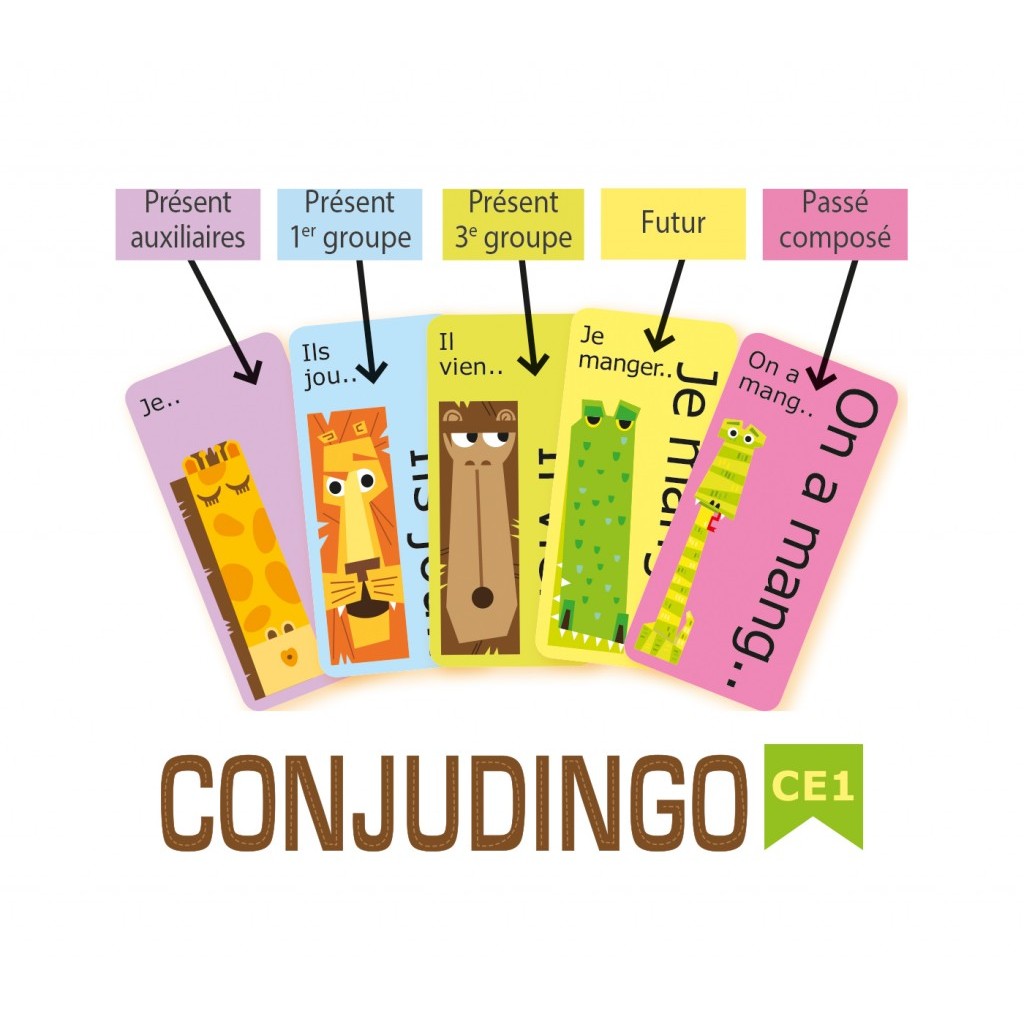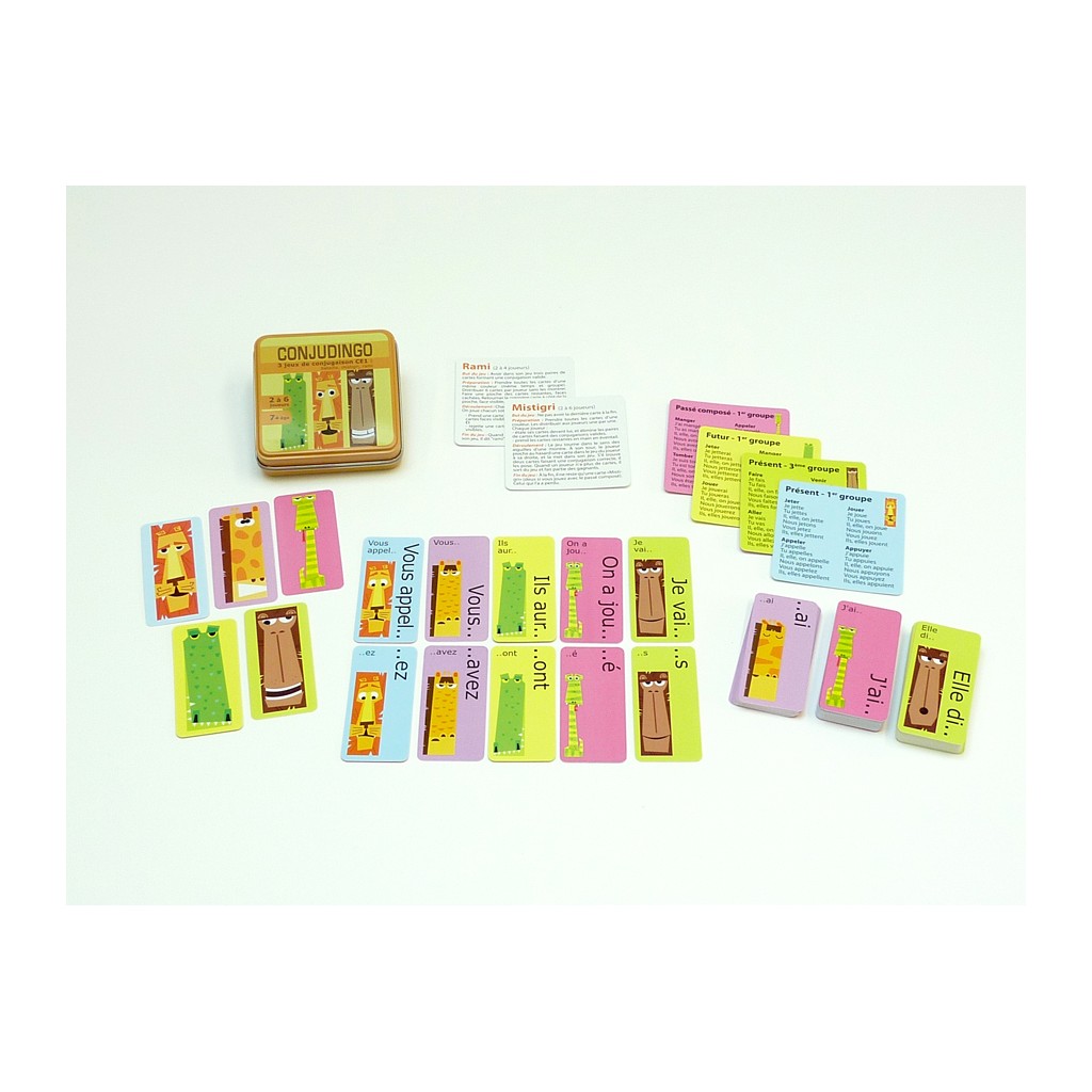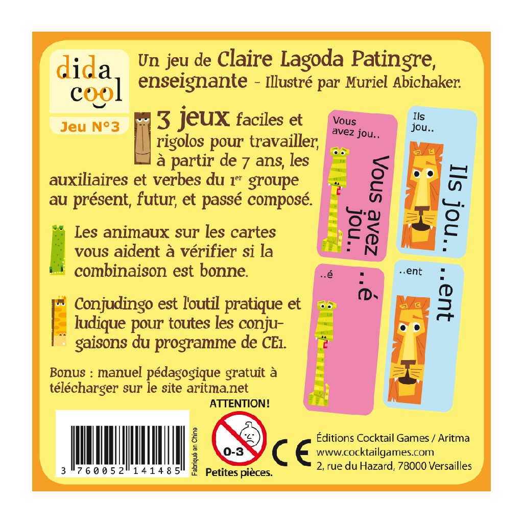 Avec ARITMA Conjudingo découvrez trois jeux faciles et rigolos pour travailler passé composé, présent et futur simple avec les enfants, du CE1 au CM1 (4-6ème H)Grâce à Conjudingo, conjuguer rime maintenant avec s’amuser ! Il y en aura pour tous les goûts avec un jeu de bataille, un rami et un mistigri !Conjudingallie trois petits jeux rigolos à un système de vérification des réponses aussi mignon qu’astucieux : les animaux sur les cartes permettent de voir d’un seul coup d’œil si une réponse est correcte ou non ! •Un jeu de Claire Lagoda Patingre, enseignante. • Trois jeux en un. • Si les animaux de 2 cartes sont identiques, l’enfant a trouvé ! Contenu La boîte de jeu contient 2 cartes de règles, 4 cartes d’aide comprenant des verbes conjugués et plus de 100 cartes de conjugaison petit format.