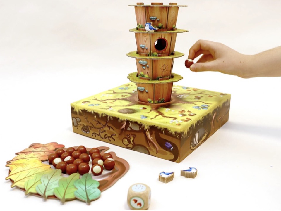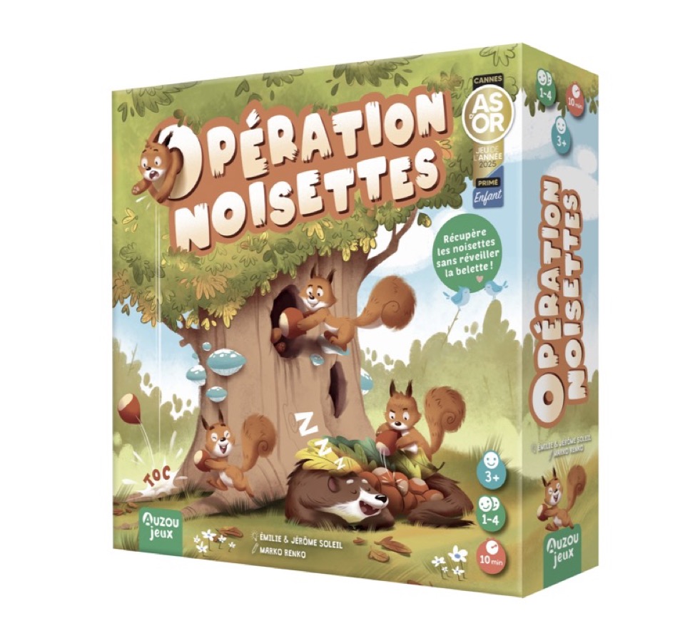 Oh non, l’hiver arrive et la belette a volé toutes les noisettes des écureuils avant de s’endormir au pied de l’arbre !Aide vite les écureuils à récupérer toute leur réserve, mais attention, la belette ne dort que d’un seul œil !Arriverez-vous à remettre toutes les noisettes dans l’arbre sans la réveiller ?Contenu :1 arbre à assembler1 belette20 noisettes en bois4 oiseaux en bois10 feuilles en carton1 dé en bois1 sac en tissu