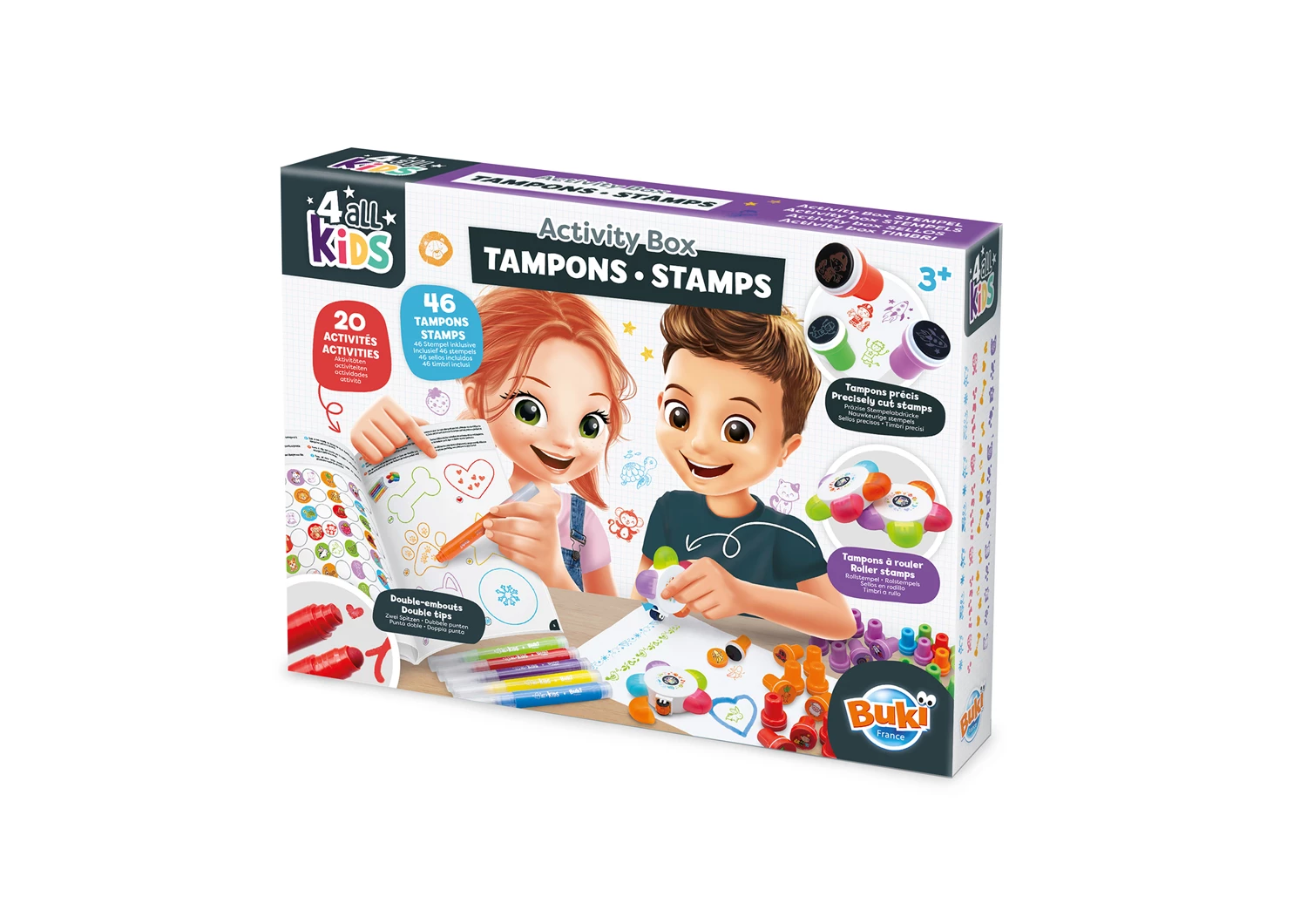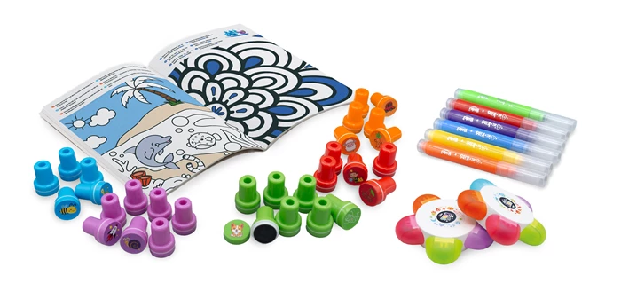 Un coffret avec 46 tampons variés et colorés ! Colorie le livret avec les feutres et remplis les décors avec les tampons…Contient: 30 tampons (6 orange, 6 bleus, 6 verts, 6 violets, 6 rouges), 2 tampons fleurs pour un total de 10 bandes de motifs, 6 feutres pointes rondes et embouts tampons. Livret d’activités en couleurs de 20 pages.