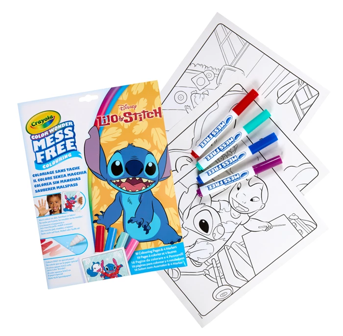 Le coffret de coloriage Color Wonder CRAYOLA contient 18 pages à colorier sur le thème de Lilo & Stitch et 4 feutres Color Wonder en acier inoxydable.L'encre est transparente et ne tache ni la peau, ni les meubles, ni les tissus, car la couleur apparaît uniquement sur le papier spécial Color Wonder. En passant le feutre sur le papier, des motifs cachés se révèlent ! La pochette refermable est idéale pour les voyages et les sorties, permettant d'occuper les enfants lors de longs trajets en voiture par temps pluvieux.Tous les produits Color Wonder sont compatibles avec ce coffret, offrant ainsi une infinité de possibilités créatives. Un cadeau idéal pour Pâques, un anniversaire ou Noël, pour les enfants à partir de 3 ans.