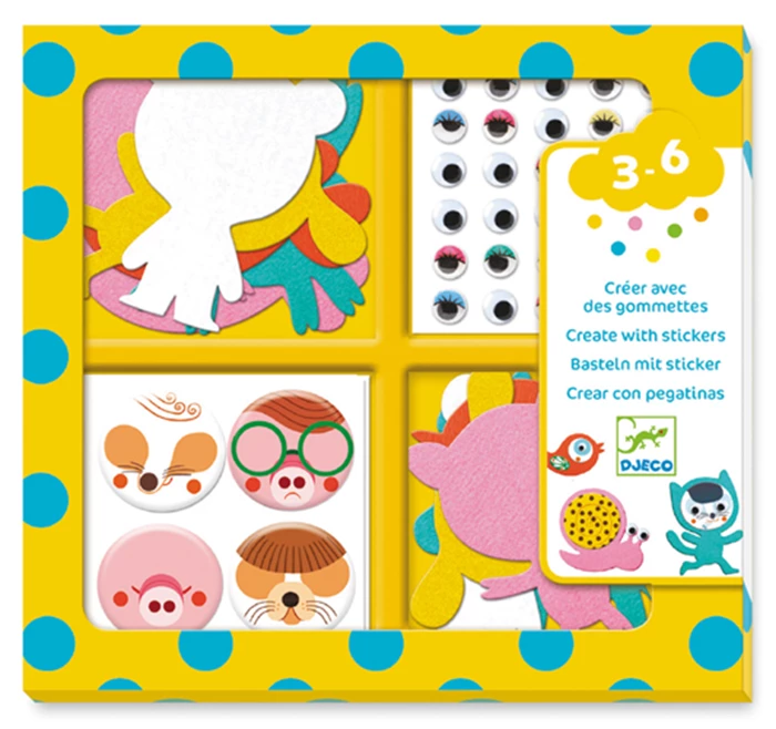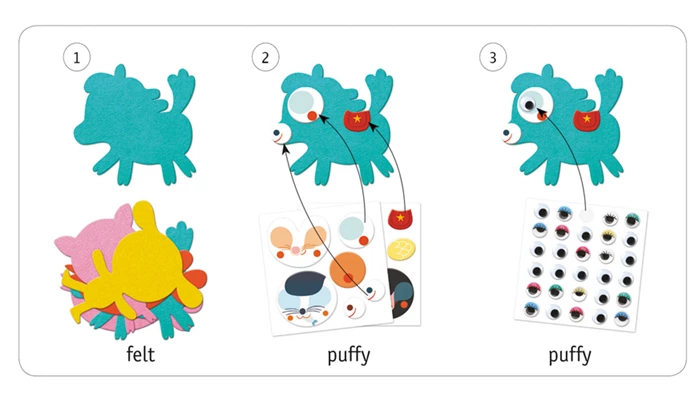 De la feutrine autocollante et des gommettes en volume, pour composer et coller, coller !