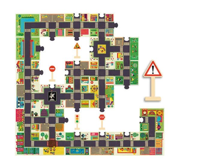 Le puzzle de sol La Ville de Djeco combine le plaisir de faire un puzzle avec le plaisir de jouer.En effet, une fois le puzzle terminé, il sert de surface de jeu pour les voitures des petits. Les panneaux de circulation inclus permettent de régler la circulation. Les éléments se combinent de différentes manières, il est ainsi possible de créer différents trajets. Le petit plus: les enfants se familiarisent déjà avec les panneaux de la circulation. Bref, ils ne s’ennuient pas! Dimensions du puzzle terminé: 100x63cm.