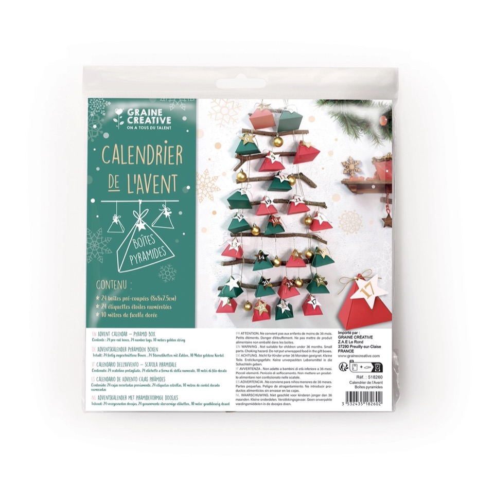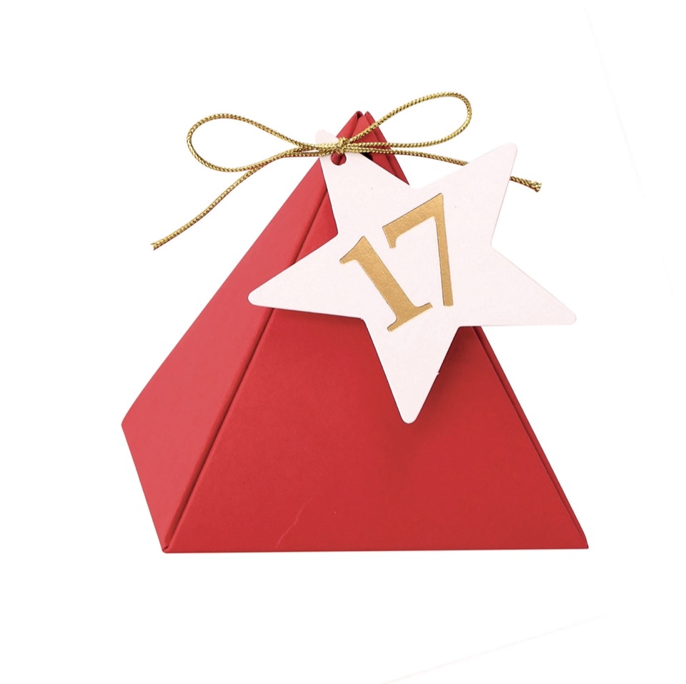 Offrez une surprise quotidienne avec notre calendrier de l’avent 24 boites pyramides. Chaque boîte pré-coupées mesure 8x8x7,5cm. Vous pouvez mettre à l’intérieur une variété de petites surprises.CONTENU : 24 étiquettes étoiles numérotées, 24 étiquettes étoiles numérotées et 10 mètres de ficelle dorée