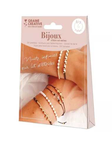 Découvrez le Kit bijoux or et noir de Graine Créative, un coffret créatif de la collection DIY & Relax pour les enfants à partir de 7 ans permettant de réaliser de magnifiques bijoux délicats et raffinés.Avec ce kit réalisez une série de bracelets dans les tons or, blanc et noir. Faciles à faire, faciles à porter, ils s’harmoniseront avec toutes vos tenues. Un kit idéal à s'offrir ou à offrir.Un coffret pour créer des bijoux originaux, une belle idée de cadeau à offrir pour un anniversaire ou à Noël.