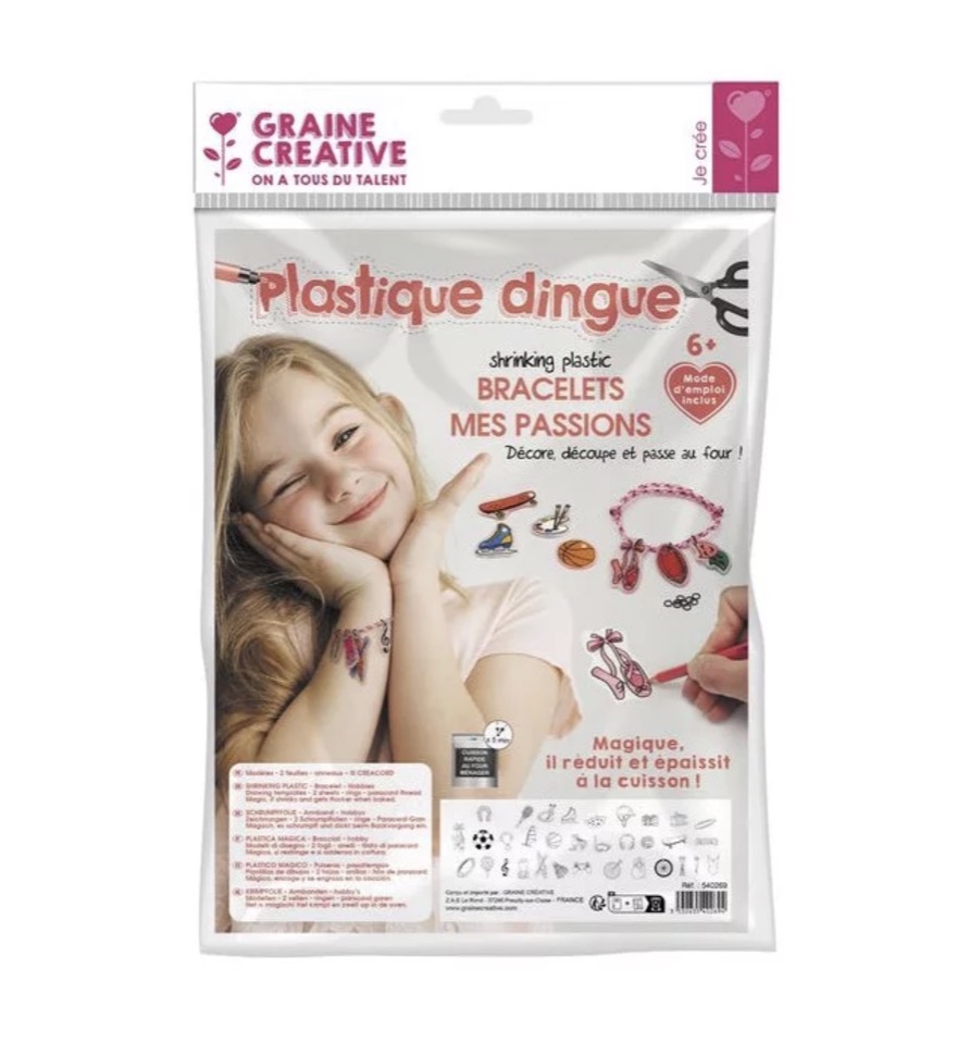 Découvrez le Kit Plastique dingue bracelets mes passions de Graine créative, une activité créative à partir de 6 ans pour réaliser des bracelets pour afficher ses passions.Fan de sports, lecture, cinéma, jeux vidéo ou musique, il y a plus de 30 passions sur les planches à décalquer. Une fois décalqués, coloriés, découpés et passés au four, accroche tes charm’s sur ton bracelet en creacord à l’aide des anneaux brisés.Le plastique dingue est magique et permet de créer de petits objets décoratifs. Tout part d'une simple feuille de plastique sur laquelle nous allons dessiner et colorier. Puis, nous la découpons et la mettons au four. Sous l'effet de la chaleur, la matière se rétracte et les couleurs s'intensifient.Un très joli cadeau pour les enfants qui aiment les activités manuelles et le coloriage.