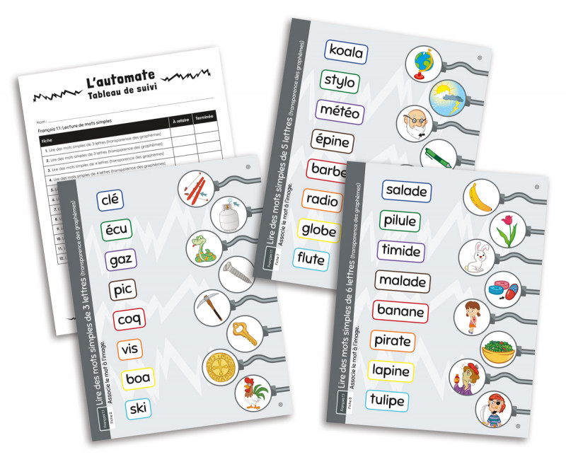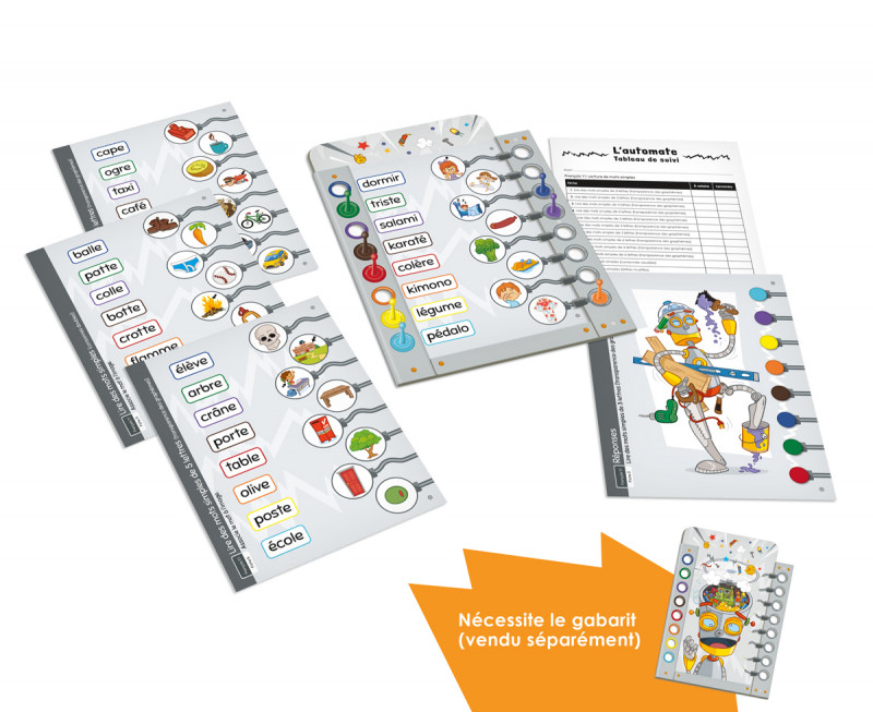 Jeu individuel d’association destiné aux élèves du 1er cycle du primaire : 3-4ème Harmos, ciblant l’habileté à identifier des mots à l’aide de la correspondance graphophonologique (décodage). Le joueur doit assembler les fils dans la tête du robot pour programmer ses actions.Le gabarit (incluant les pions) est vendu séparément.