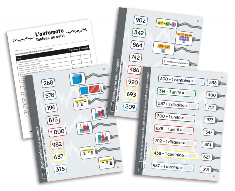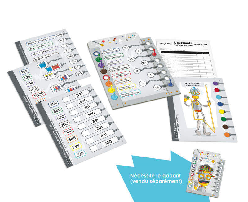 L’automate – Mathématique 1.3 : Numérotation de 0 à 1000 est un jeu individuel d’association destiné aux élèves du 1er cycle du primaire : 3-4 Harmos ciblant différentes habiletés de numération avec des nombres de 0 à 1000. Le joueur doit assembler les fils dans la tête du robot pour programmer ses actions.Le gabarit (incluant les pions) est vendu séparément.