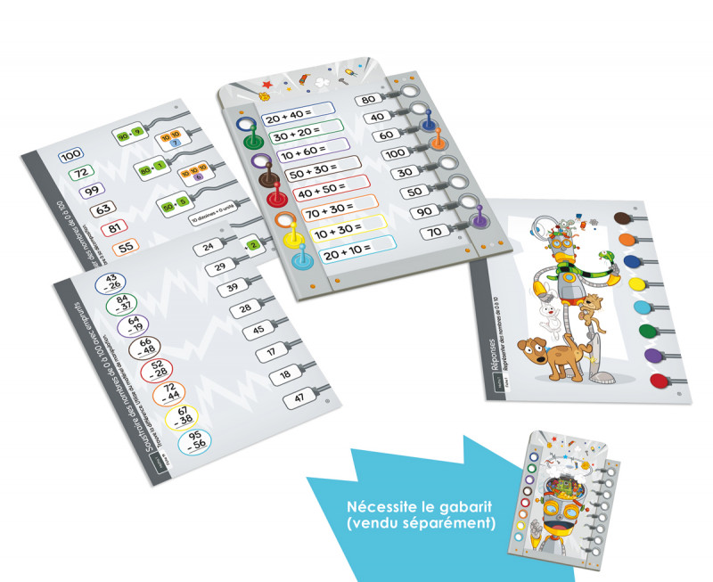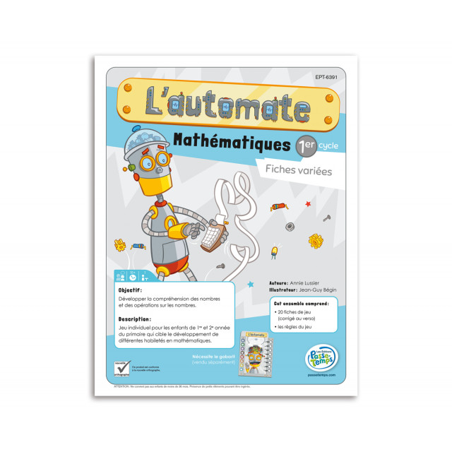 L’automate – Mathématiques 1er cycle – Fiches variées est un jeu individuel pour les enfants de 3-4H qui cible le développement de différentes habiletés en mathématiques. L’enfant doit assembler les fils dans la tête d’un robot pour programmer ses actions.Pour ce faire, il doit associer 16 éléments sur une fiche placée à l’intérieur d’un gabarit qui représente la tête du robot. Les réponses se trouvent au verso de chaque fiche, ce qui permet à l’enfant de se corriger de façon autonome.L’ensemble comprend 20 fiches, chacune ciblant un objectif précis. Le gabarit (incluant les pions) est vendu séparément. Un ensemble de20 fiches en français est également disponible.