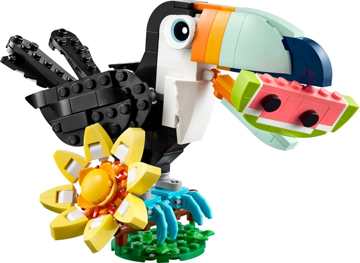 3 animaux: un toucan qui peut tenir une tranche de pastèque dans son bec, un papillon coloré qui bat des ailes en survolant une fleur, et un poisson tropical aux nageoires mobiles qui peut tourner à 360° sur son support représentant un fond marin.
