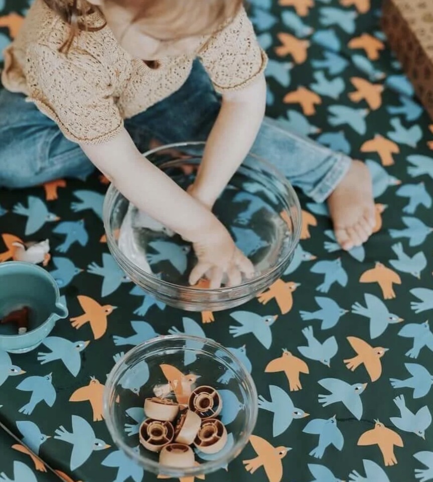 Réversible : une face en velours de coton couleur vert de gris et l’autre face en imperméable vert à motifs oiseaux certifiés sans substance nocive.