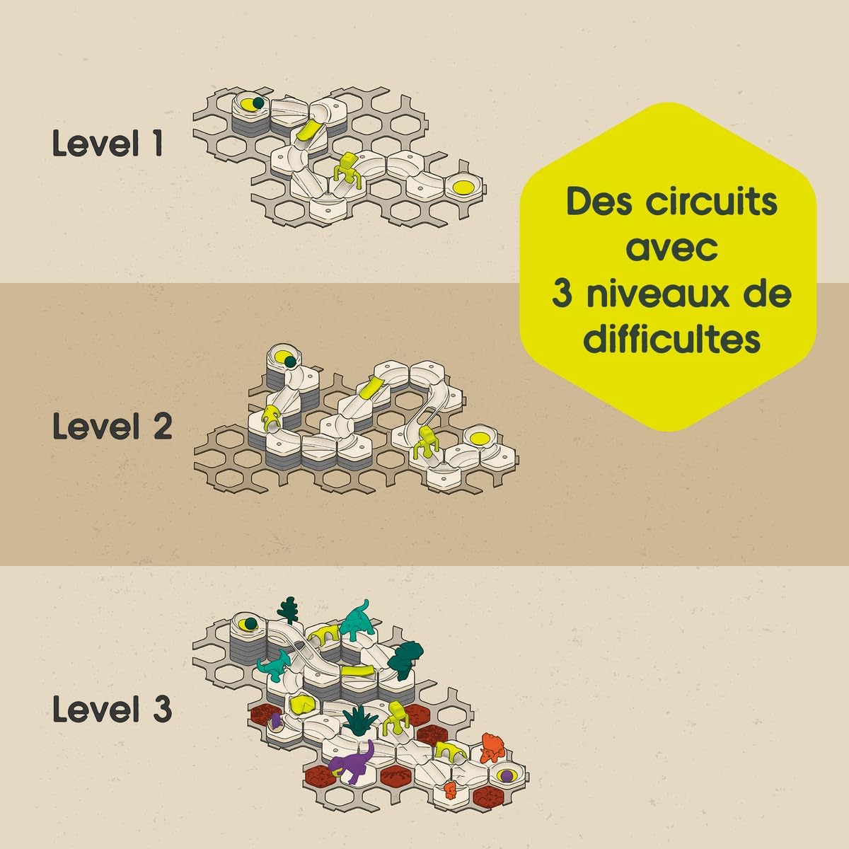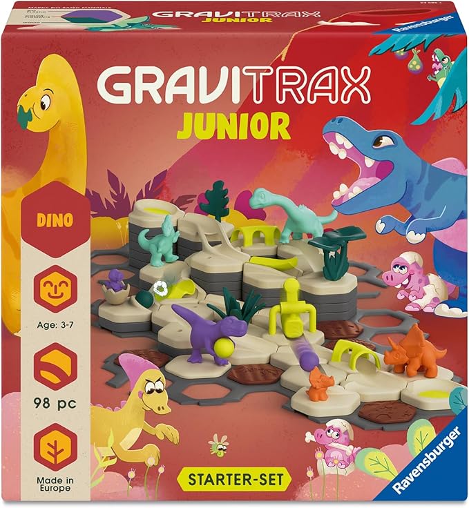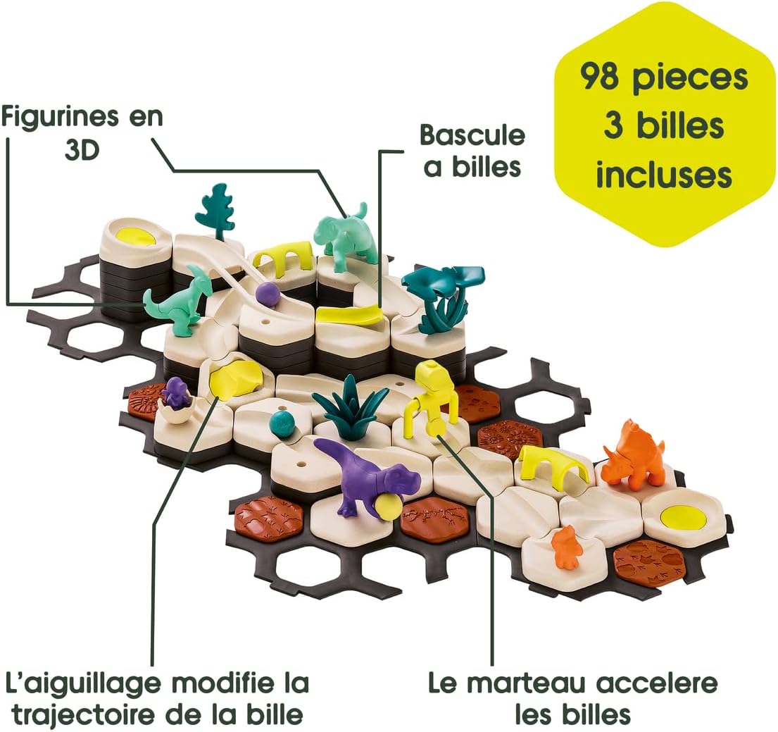GRAVITRAX JUNIOR POUR 3 ANS : INITIATION A LA CONSTRUCTION GRAVITRAX grâce à un coffret complet de 100 pièces pour construire des circuits de billes sur le THEME DINOSAURE. Avec JUNIOR, les tout-petits s'amusent à combiner des blocs pour créer des circuits amusants et colorés. Ils peuvent suivre des modèles ou inventer leurs propres circuits. MODULABLE A L'INFINI et COMPATIBLE avec tous les produits GraviTrax JUNIOR. Avec ce Starter Set, les tout-petits peuvent immédiatement commencer à jouer et à construire des circuits. Découvrez une large gamme JUNIOR de sets d'extension et d’éléments, tous combinables entre eux, pour booster les circuits. CONTENU 100 PIECES : 6 plaque de base, 3 pentes, 3 lignes droites, 3 petits virages, 9 grands virages, 1 pont, 2 tunnels en courbe, 1 aiguillage , 3 billes, 36 blocs de construction, 1 départ, 1 arrivée, 1 marteau, 1 bascule, 11 éléments de décoration 3D, 6 blocs à décorer, 6 plaquettes de décoration et d'autres pièces. 1 notice d'utilisation. Une IDEE CADEAU idéale pour un anniversaire ou Noël. CONÇU POUR 3 ANS Les pièces sont pensées pour les tout-petits avec un contenu facile à prendre en main. Les matériaux sont principalement issus de ressources renouvelables, fabriqués en Europe et issus de MATIERES BIOSOURCES : fibres de bois et plastique bio. Les pièces sont fabriquées de manière à durer et à garantir des heures de jeu. JEU EDUCATIF STEM : GraviTrax JUNIOR favorise l'apprentissage de l'enfant en stimulant sa réflexion lors de la conception des circuits de billes ainsi que ses capacités motrices et ses relations de cause à effet lors du jeu. Les éléments décoratifs jungle inclus stimulent également la création et l'imagination des enfants.