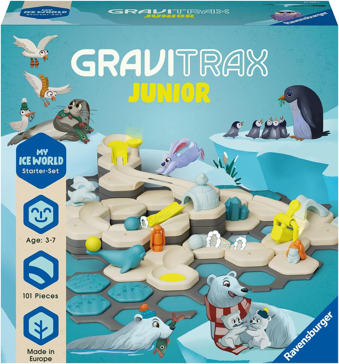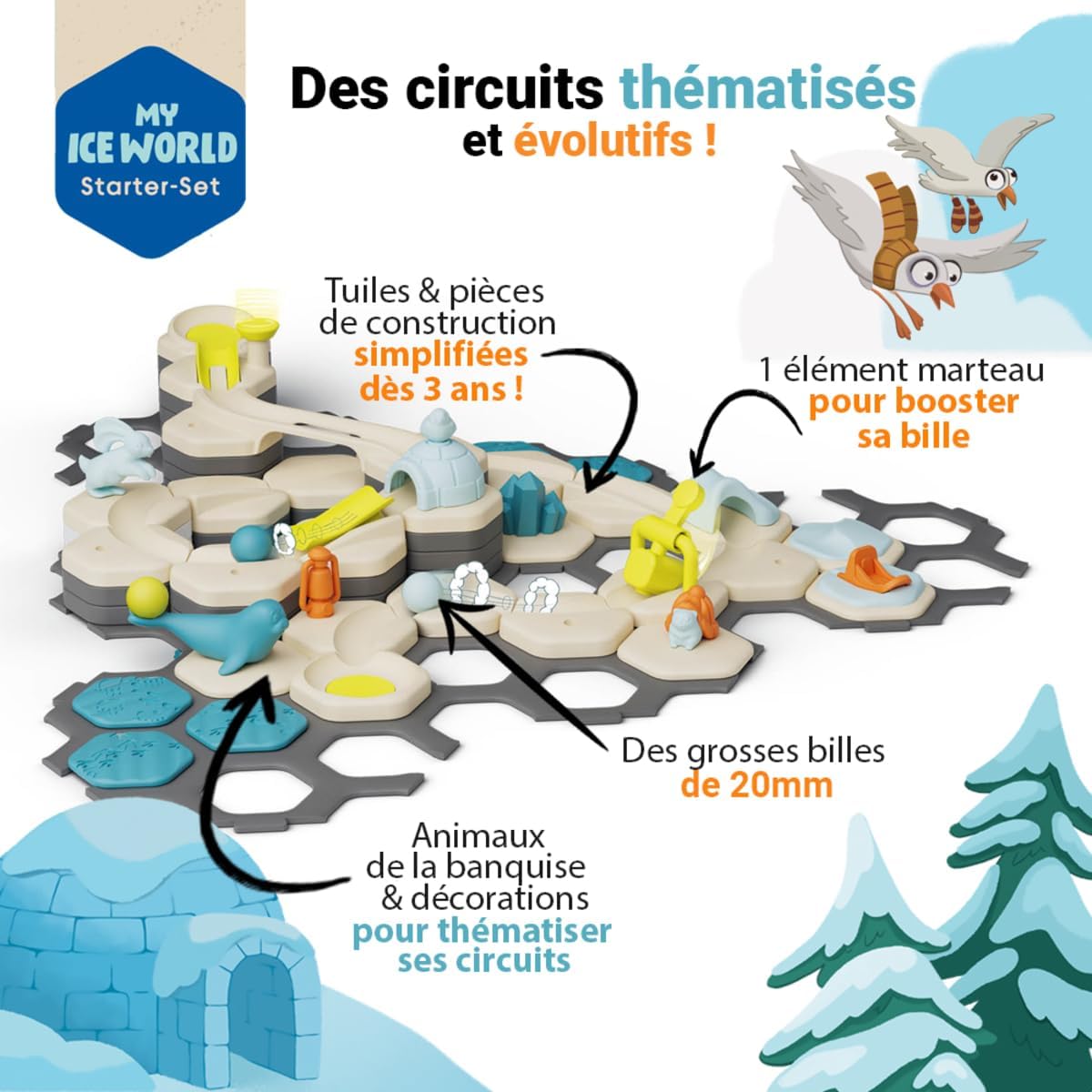 GRAVITRAX JUNIOR POUR 3 ANS : INITIATION A LA CONSTRUCTION GRAVITRAX grâce à un coffret complet de 200 pièces pour construire des circuits de billes avec 4 THEMES : jungle, banquise, desert et océan. Avec JUNIOR, les tout-petits s'amusent à combiner des blocs pour créer des circuits amusants et colorés. Ils peuvent inventer ou suivre des modèles. MODULABLE A L'INFINI et COMPATIBLE avec tous les produits GraviTrax JUNIOR. Avec ce Starter Set XXL, les tout-petits peuvent immédiatement commencer à jouer et à construire des circuits. Découvrez une large gamme JUNIOR de sets d'extension et d’éléments, tous combinables entre eux, pour booster les circuits. CONTENU 100 PIECES : 6 plaques, 3 billes, 36 blocs, 1 pont, 4 lignes droites, 4 pentes, 11 grands virages, 4 petits virages, 1 départ, 1 arrivée, 1 tourbillon, 1 marteau, 1 bascule, 9 éléments de décoration 3D, 4 animaux en carton, 6 blocs base ouverte, 6 bases décoration et 1 notice avec plans. Une IDEE CADEAU idéale pour un anniversaire ou Noël.CONÇU POUR 3 ANS Les pièces sont pensées pour les tout-petits avec un contenu facile à prendre en main. Les matériaux sont principalement issus de ressources renouvelables, fabriqués en Europe et issus de MATIERES BIOSOURCES : fibres de bois et plastique bio. Les pièces sont fabriquées de manière à durer et à garantir des heures de jeu. JEU EDUCATIF STEM : GraviTrax JUNIOR favorise l'apprentissage de l'enfant en stimulant sa réflexion lors de la conception des circuits de billes ainsi que ses capacités motrices et ses relations de cause à effet lors du jeu. Les éléments décoratifs jungle inclus stimulent également la création et l'imagination des enfants.